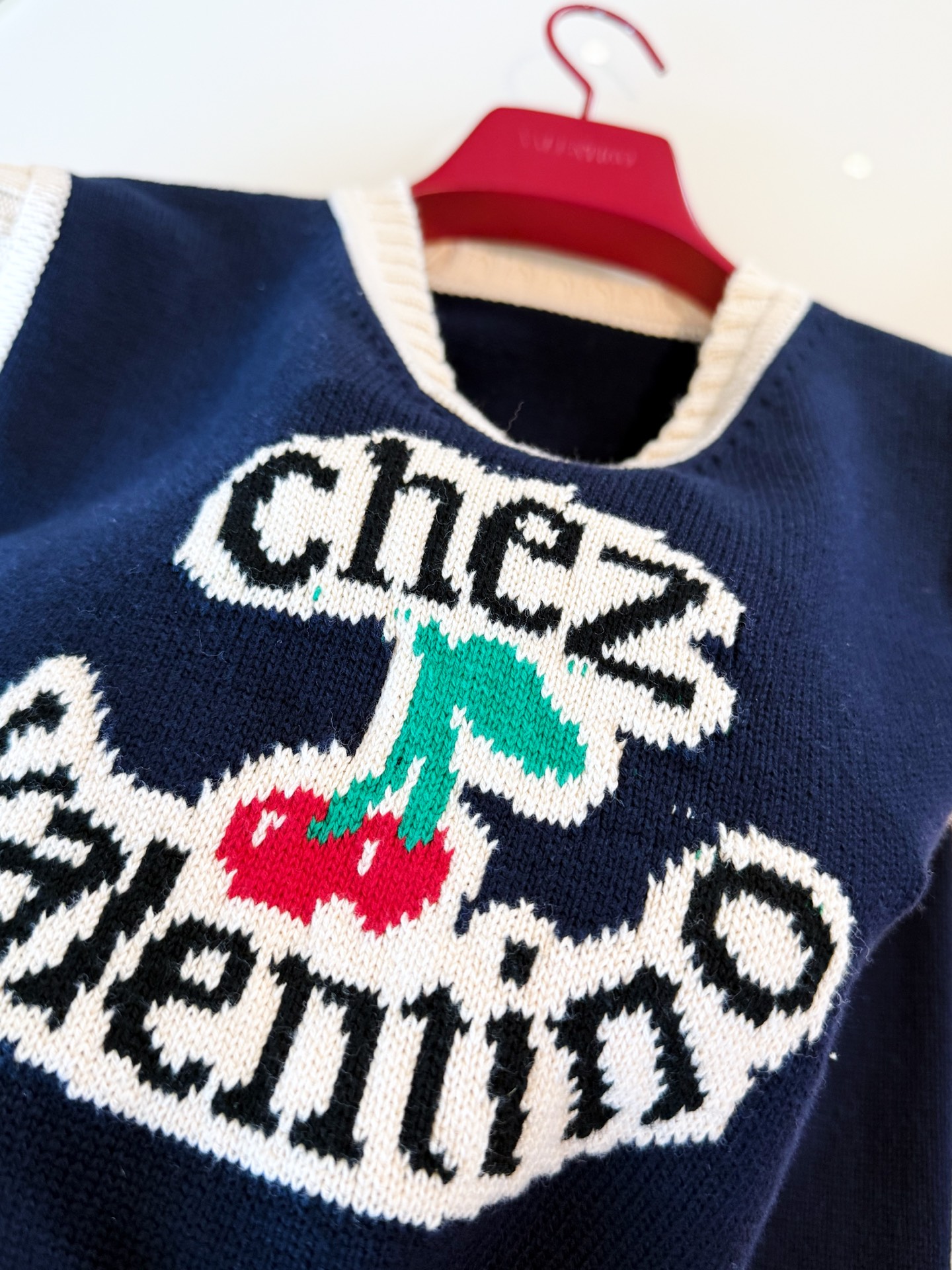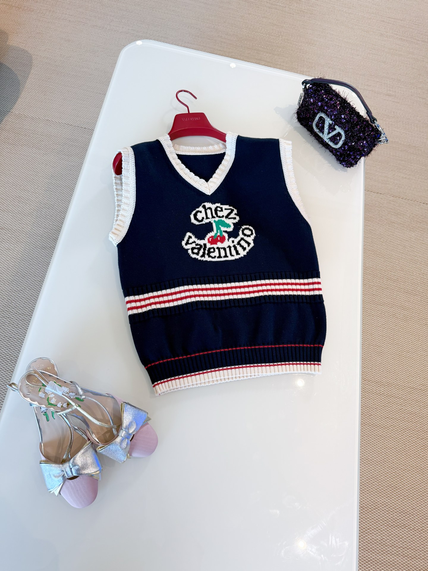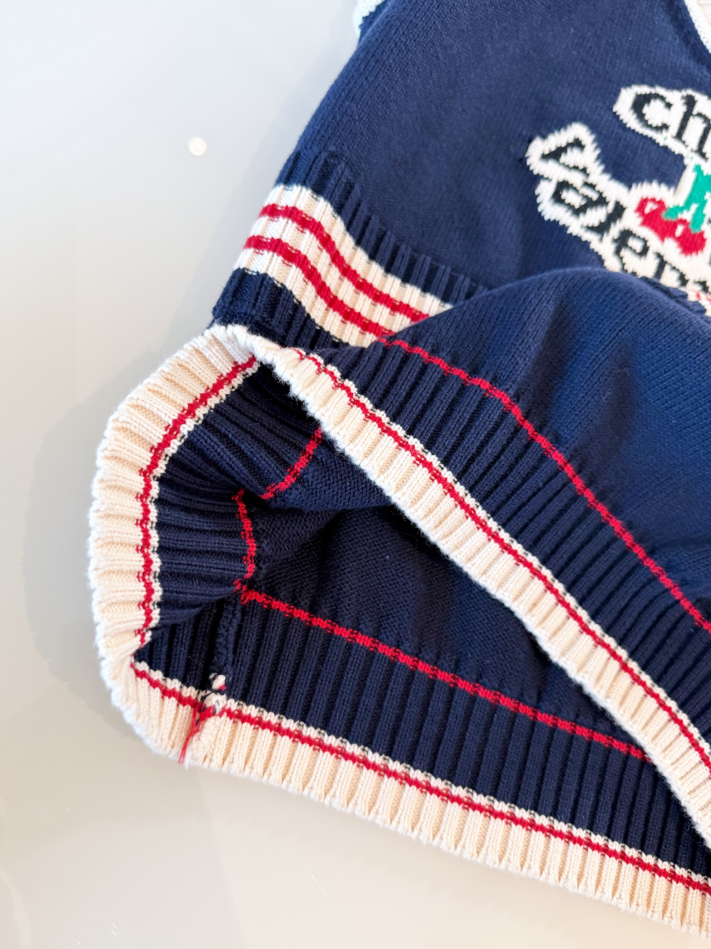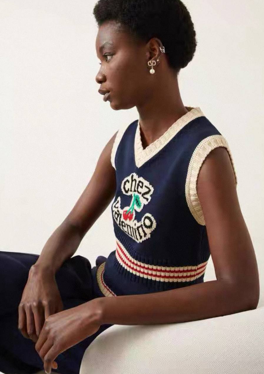 Стильный вязаный жилет от Valentino в насыщенном темно-синем цвете. Модель выполнена в спортивном стиле без рукавов, с V-образным вырезом, декорированным контрастной белой отделкой. По центру размещена вышивка с надписью "chez Valentino" и эффектным изображением вишен. Узорные полоски на талии и по низу изделия сочетают белый и красный цвета, добавляя динамики образу. Жилет прекрасно подойдет для многослойных стильных сочетаний и станет ярким акцентом повседневного гардероба.